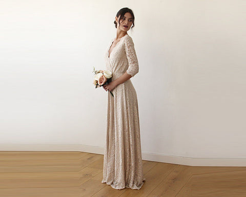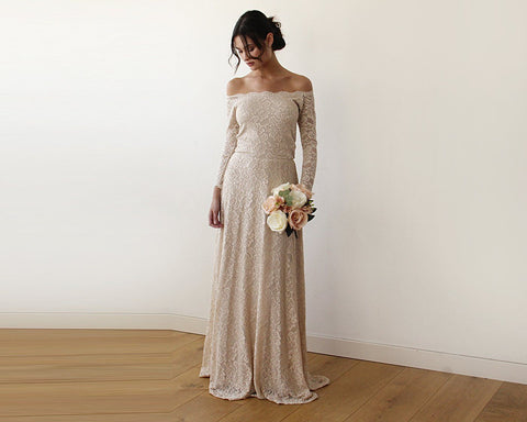 Off-The-Shoulder Blush Pink Floral Lace Long Sleeve Maxi Dress 1119